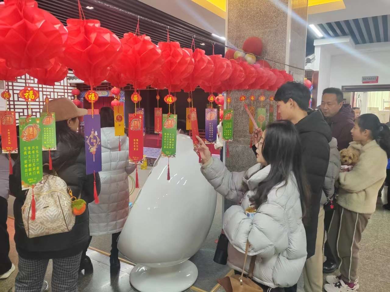 该馆二楼长廊装饰得喜气洋洋,红灯笼高挂,非遗主题灯谜长廊蜿蜒伸展,成为最热闹的打卡地。记者看到,灯笼下方悬挂着几百条谜题,内容涵盖字谜、成语、地名等,既有娱乐性,又有知识性。“春来植树勤出力”“丁老头嫁女儿”……大家相互交流探讨、集思广益,或独自推敲,豁然开朗。猜中谜底的市民,手持兑奖券兑换非遗小礼品,脸上洋溢着满满的成就感。