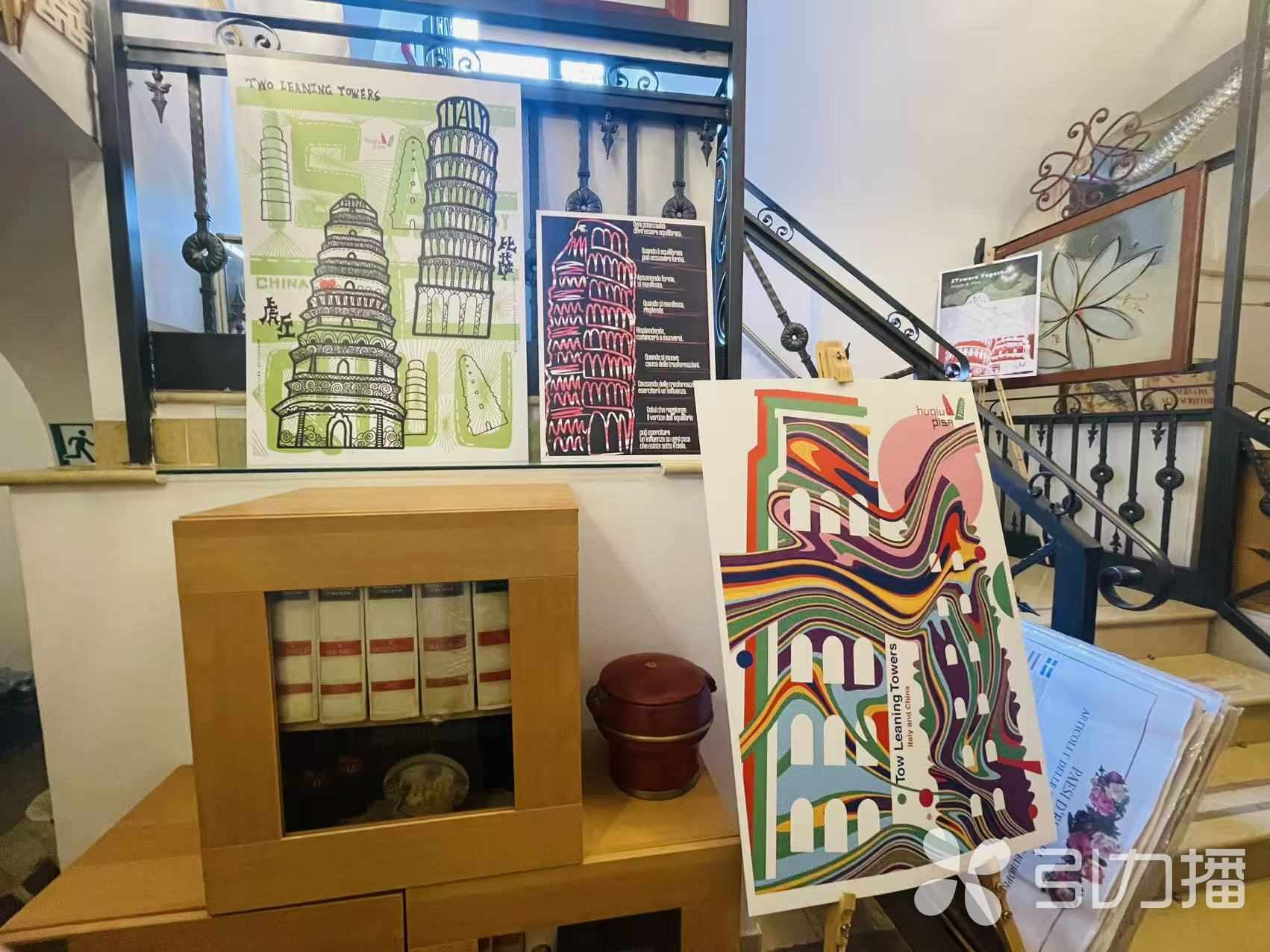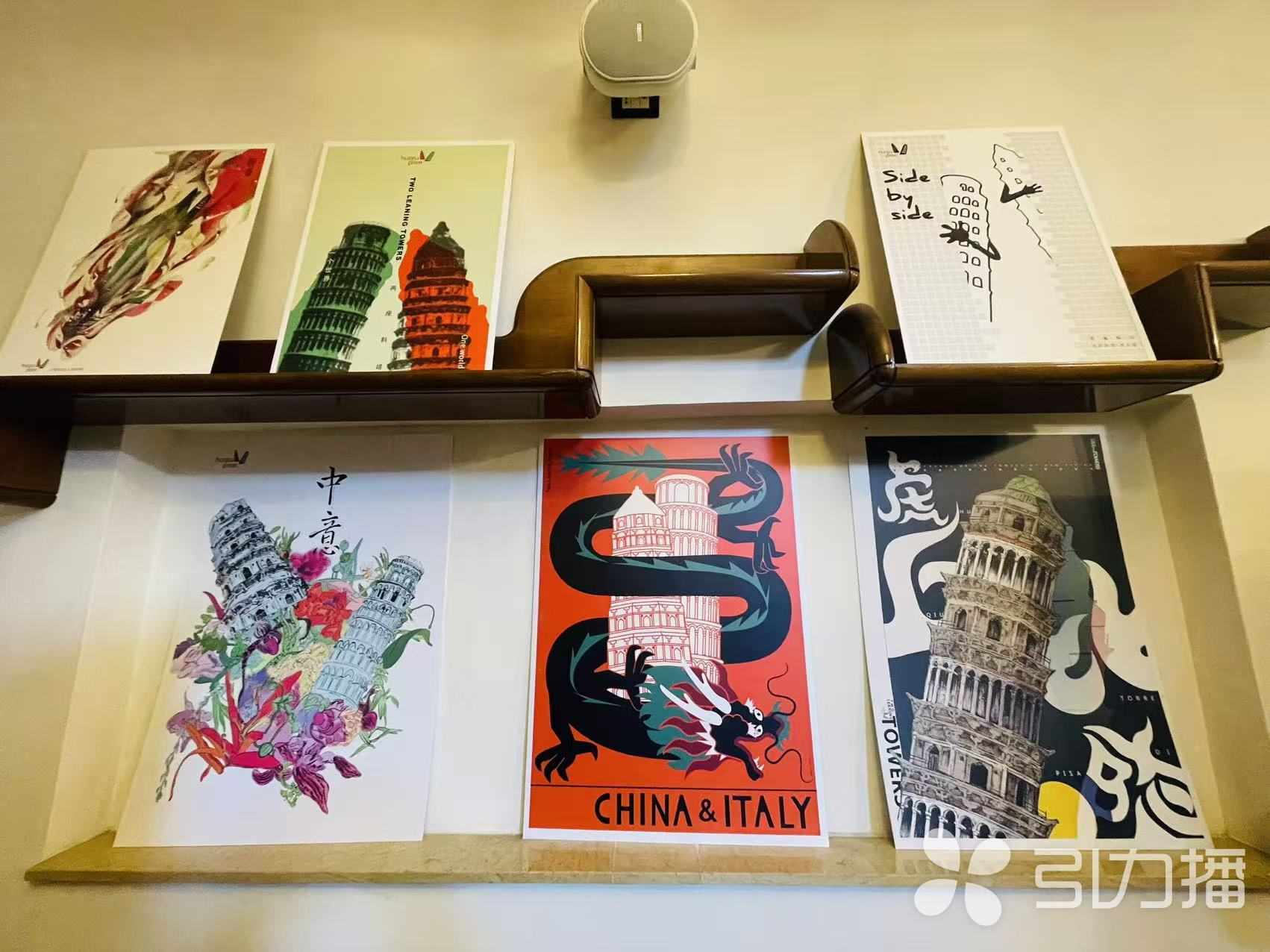 海报设计师们用视觉语言打破了地理的界限。有的以意大利国旗绿白红三色为底,中国地图轮廓隐现其间,两座斜塔的剪影并置而立;有的将中国龙的形象与双塔结合,红色背景滚烫热烈,烘托出东方文化的开放姿态;还有的运用泼墨式文字解构重组,穿插感官元素与苏州园林云纹装饰,邀请观众用感官去感受两座塔的相遇。