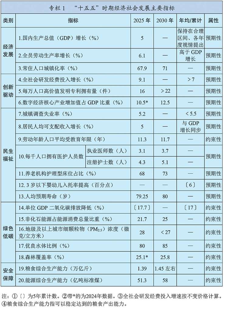 新发展理念引领作用全面彰显,构建新发展格局迈出重要步伐,新质生产力稳步发展,高质量发展扎实推进。经济运行稳中有进,国内生产总值突破140万亿元,现代化产业体系建设取得重大进展,基础设施支撑能力不断提升,数字经济核心产业增加值占比超过10.5%,城乡区域发展平衡性协调性增强。科技创新成果丰硕,全社会研发经费投入强度达到2.8%,攻克一批重大关键核心技术,取得一批重大原创科技成果。全面深化改革进一步推进,落实“两个毫不动摇”的体制机制不断完善,全国统一大市场建设取得积极成效,宏观经济治理效能进一步提升。高水平对外开放不断扩大,开放型经济新体制加快形成,高质量共建“一带一路”走深走实。全过程人民民主深入发展,全面依法治国有效实施。文化事业和文化产业蓬勃发展,精神文化产品丰富多彩。民生保障扎实稳固,居民人均可支配收入年均增长5.4%,城镇新增就业累计达到6242万人,劳动年龄人口平均受教育年限达到11.3年,人均预期寿命提升至79岁以上,脱贫攻坚成果巩固拓展。绿色低碳转型步伐加快,生态环境质量持续改善,非化石能源发电装机容量超过化石能源,地级及以上城市细颗粒物(PM2.5)浓度降至28微克/立方米,地表水达到或好于Ⅲ类水体比例超过90%,森林覆盖率超过25%。国家安全能力有效提升,粮食产量迈上1.4万亿斤大台阶,社会治理效能增强,社会大局保持稳定。国防和军队建设取得重大进展。“一国两制”实践深入推进。中国特色大国外交全面拓展。全面从严治党成效显著,反腐败斗争纵深推进,党的创造力、凝聚力、战斗力明显提高。