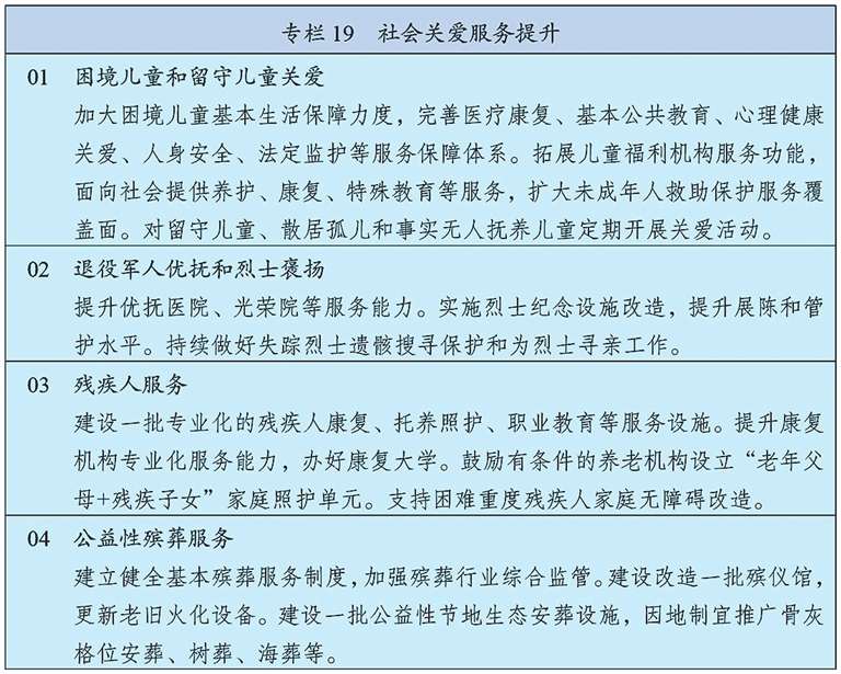 完善残疾人社会保障制度和关爱服务体系,促进残疾人事业全面发展。强化对重度残疾、多重残疾、一户多残等群体兜底保障,健全困难残疾人生活补贴、重度残疾人护理补贴制度及补贴标准动态调整机制,加强残疾儿童康复救助,健全残疾人辅助器具适配补贴制度。完善残疾人社区和家庭支持,加强重度残疾人托养照护,发展精神障碍社区康复。强化残疾人就业帮扶,完善按比例就业、集中就业、自主就业促进机制。发展残疾人文化体育。深入推进科技助残,加强公共设施、信息交流、社会服务无障碍环境建设。
