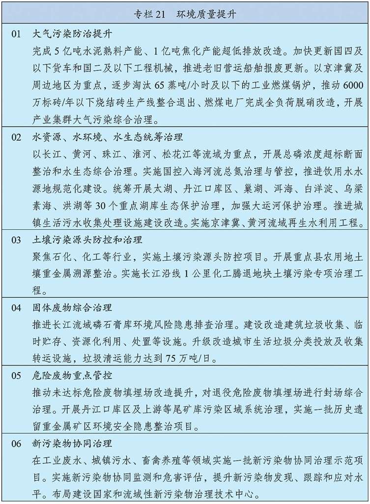 持续深入推进污染防治攻坚,以更高标准改善大气、水、土壤环境质量。以京津冀及周边、长三角、汾渭平原等重点区域为主战场,强化细颗粒物(PM2.5)控制,深入推进重点行业超低排放改造,推动挥发性有机物源头替代和全流程治理,制定下一阶段机动车排放和油品质量标准,深化大气环境绩效分级管理,氮氧化物、挥发性有机物排放量分别下降8%以上,进一步消除重污染天气。加强长江中游、成渝等区域大气污染防治。加强餐饮油烟、恶臭异味和环境噪声污染治理。统筹水资源、水环境、水生态治理,以解决全流域和跨省界突出问题为重点,加强重要江河湖库系统治理和生态保护,基本完成重点流域海域入河入海排污口排查整治,化学需氧量、总磷排放量分别下降6%,巩固城市黑臭水体治理成效、基本消除县乡黑臭水体。加强土壤污染源头防控,推进受污染耕地、建设用地安全利用。