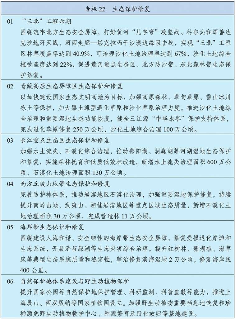 统筹推进重要生态系统保护和修复重大工程,持续巩固以“三区四带”为骨架的国家生态安全屏障体系。打好“三北”工程攻坚战,推动三大标志性战役取得决定性胜利。深入推进青藏高原生态保护,加强重点区域水土流失治理和石漠化治理。科学开展大规模国土绿化行动,推进森林质量精准提升和国家储备林建设,森林蓄积量达到224亿立方米,统筹草原生态修复与合理利用,加强湿地保护修复。推进超引地表水和超采地下水治理,开展历史遗留废弃矿山生态修复。