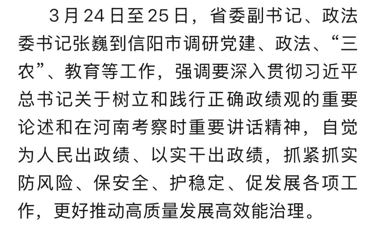 张巍到信阳市调研时强调 坚持真抓实干 厚植为民情怀 更好推动高质量发展高效能治理