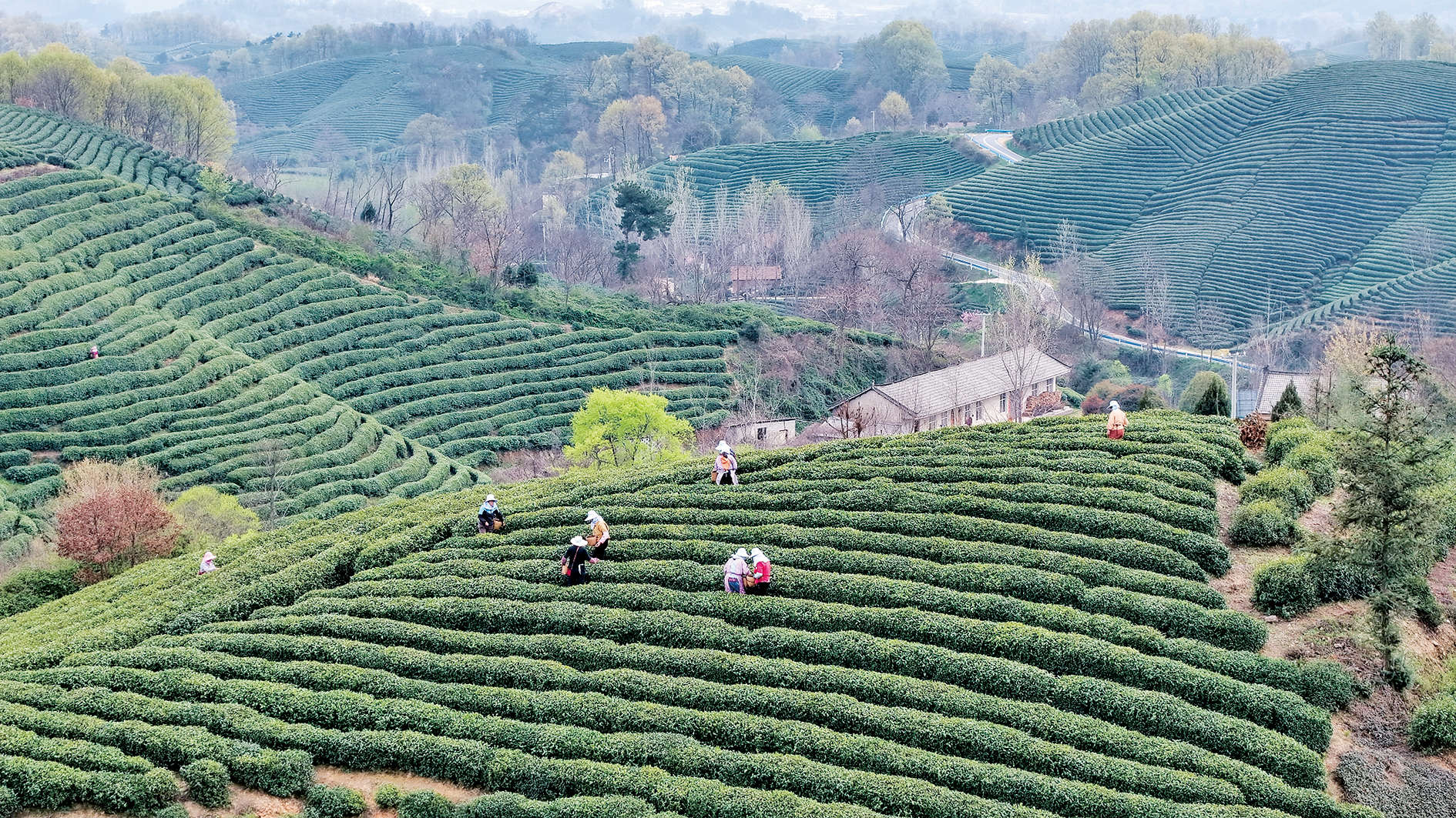 3月26日,浉河区浉河港镇黄庙村的茶山上,采茶工点缀其间,寂静的茶山顿时增添了活力。