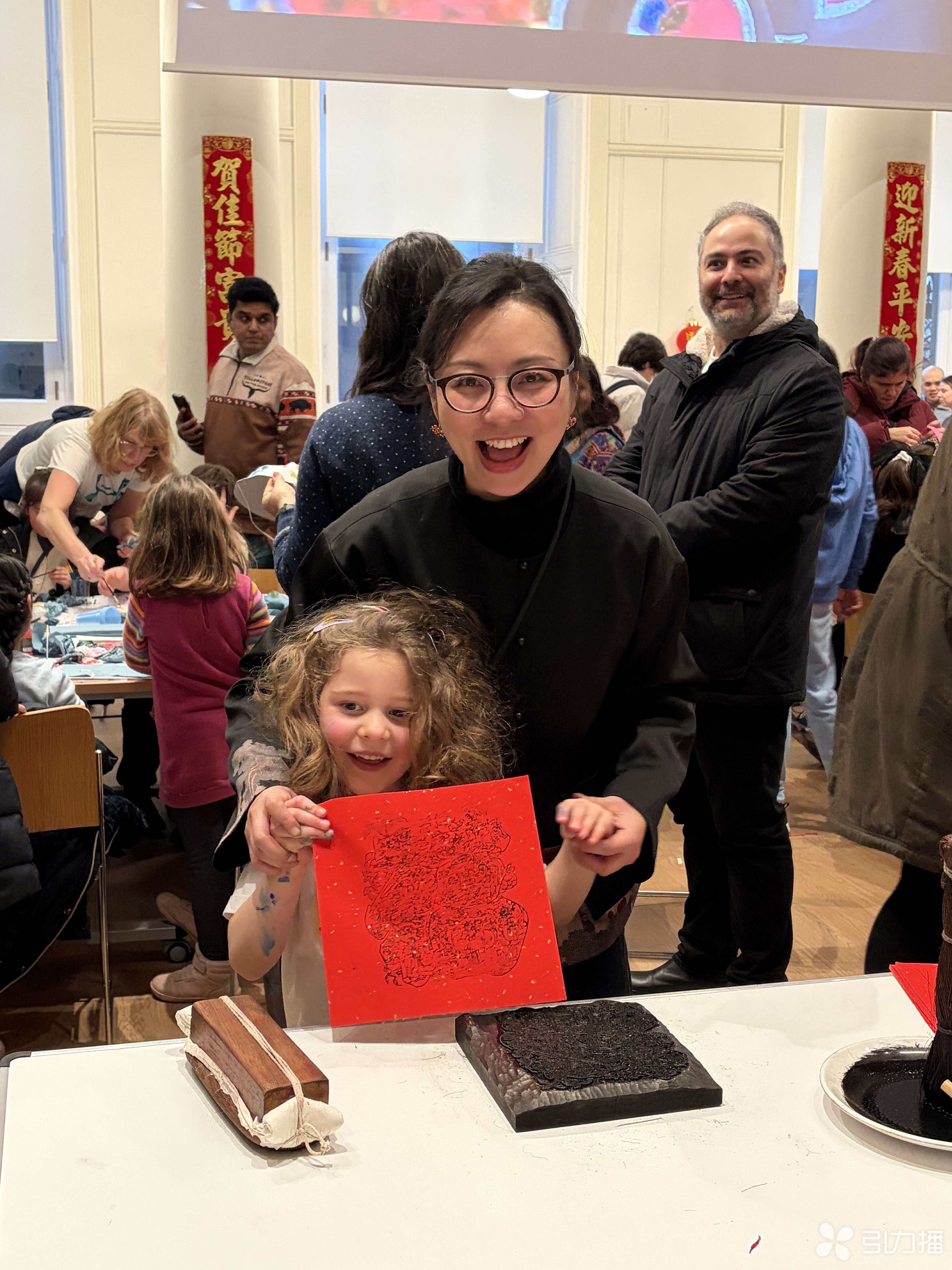 首场非遗体验活动在曼彻斯特图书馆启幕,苏工艺带来的桃花坞木版年画《福字图》雕版,成为现场最受瞩目的“主角”。这方凝聚着苏工艺非遗教学团队打磨与研究的雕版,线条流畅、纹路清晰,是桃花坞木版年画经典技艺的缩影。朱蕾结合学校非遗教学的丰富经验,将专业的技艺讲解与趣味的动手体验相结合,让非遗体验更具专业性和互动性。同时,府向红手把手教曼彻斯特市民绣制梅花图案刺绣包,穿针、引线、打籽。当天下午,活动转场曼彻斯特博物馆中国馆,年画拓印体验吸引了逾百位家庭观众参与,孩子们举着自己印好的“福”字体会中国的年味儿。
