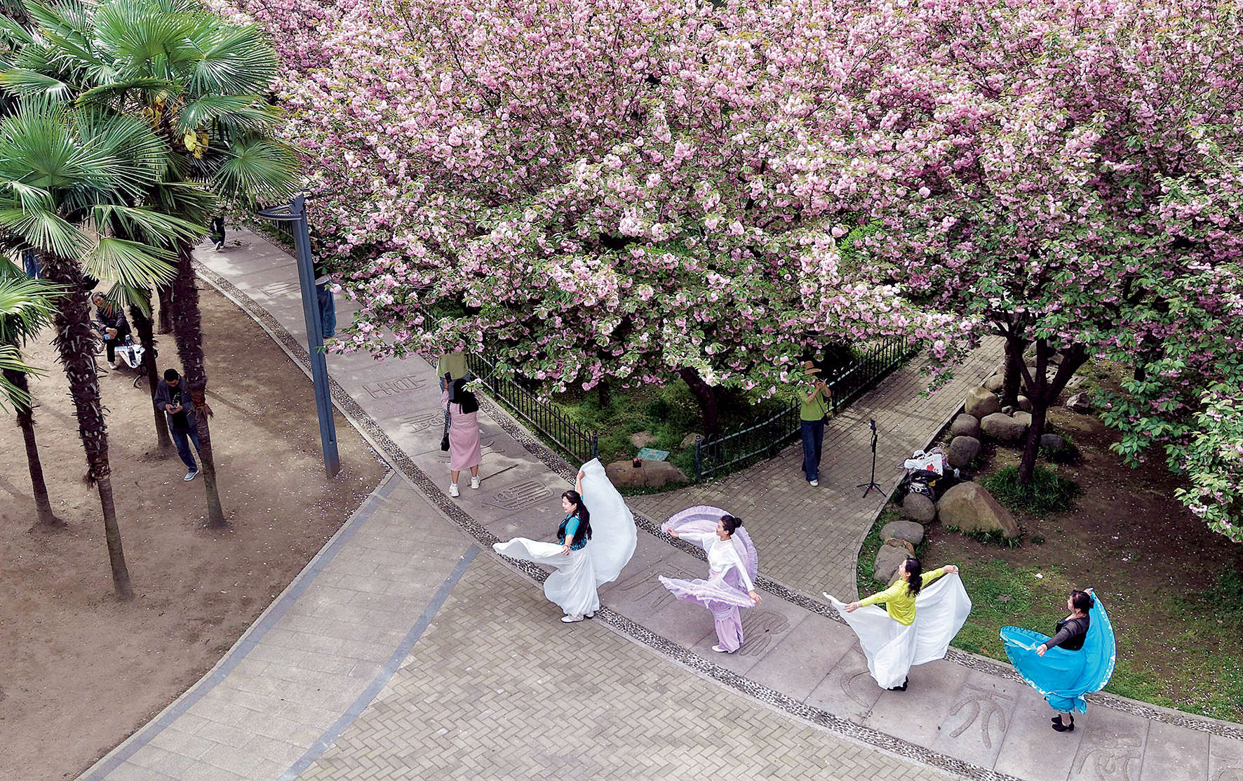 4月7日,在浉河公园的樱花树下,几名新疆舞蹈爱好者翩翩起舞。近日,浉河公园的重瓣晚樱正值盛花期,吸引众多市民和游客前来观赏、拍照留念。