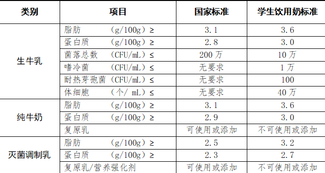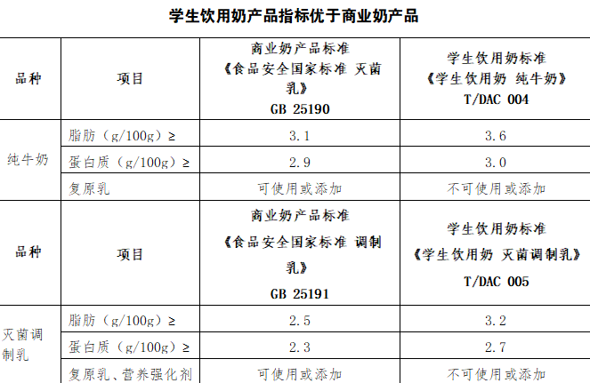 学生饮用奶系列团体标准中部分指标与国家标准对照
