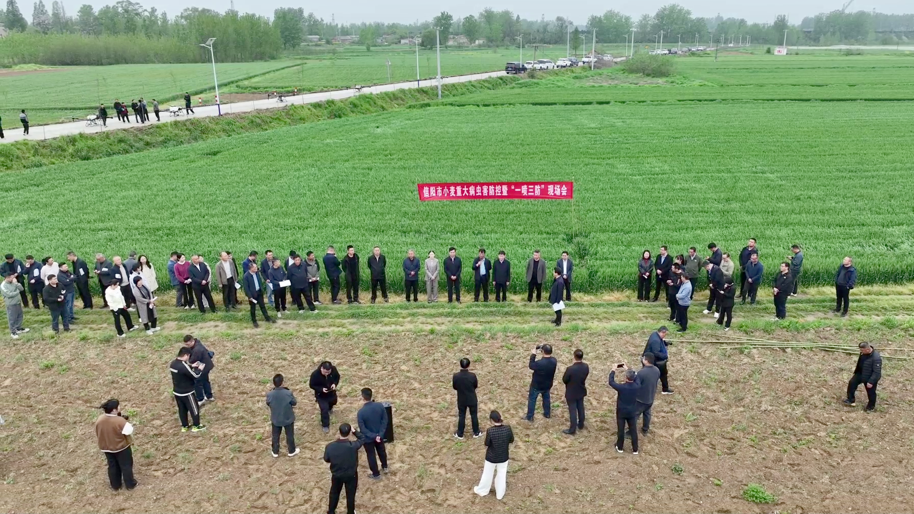 对于小麦“一喷三防”要抓住时机,“抽穗早,白花迟,扬花初期正当时。”现场会上,豫南六市小麦重大病虫害防控和“一喷三防”工作指导组第四组成员、信阳农林学院史洪中教授详细讲解了“一喷三防”的技术要点,技术人员现场进行了植保无人机作业,通过一次混合喷施杀菌剂、杀虫剂、植物生长调节剂和叶面肥演示,达到防病虫、防早衰、防干热风的效果。