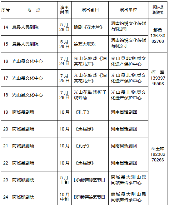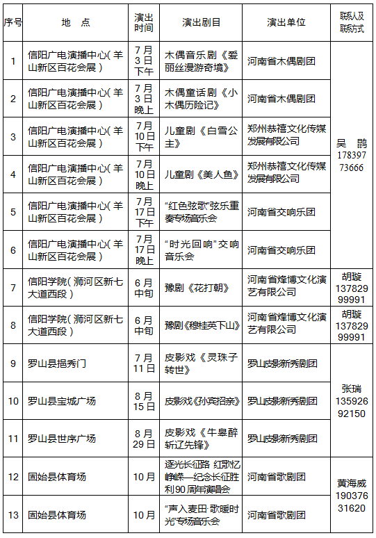 全年演出安排表及各剧场联系人、联系方式已公布,方便市民咨询。