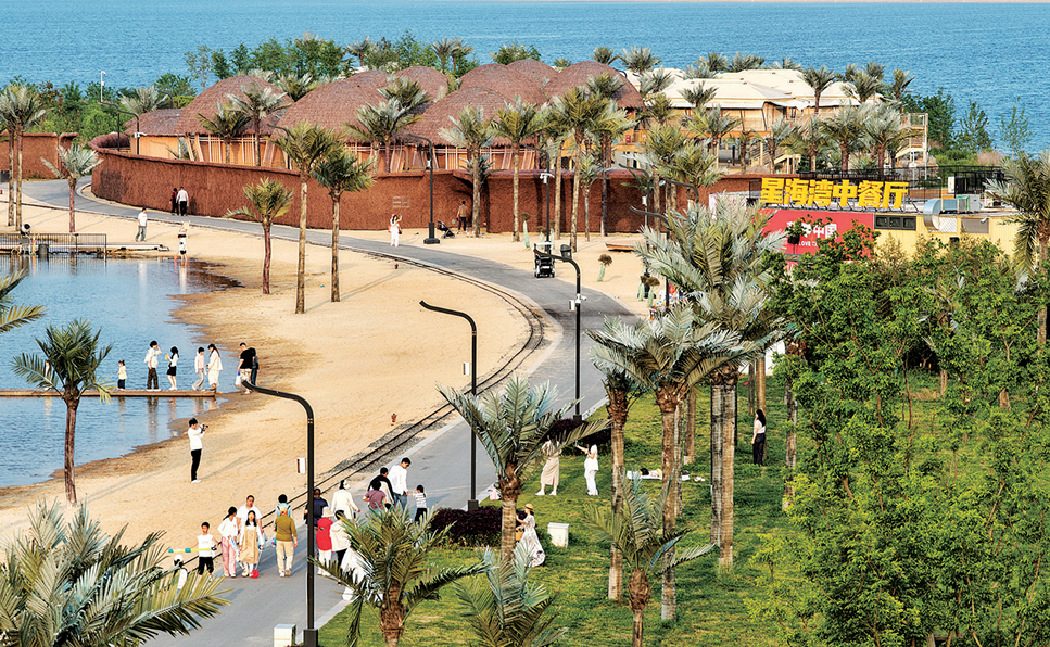 4月19日,游客在星宿川沙滩营地游玩。暮春时节,该营地草甸如茵,帐篷错落,人们在此露营烧烤、仰望星空,尽享春日生态慢生活。