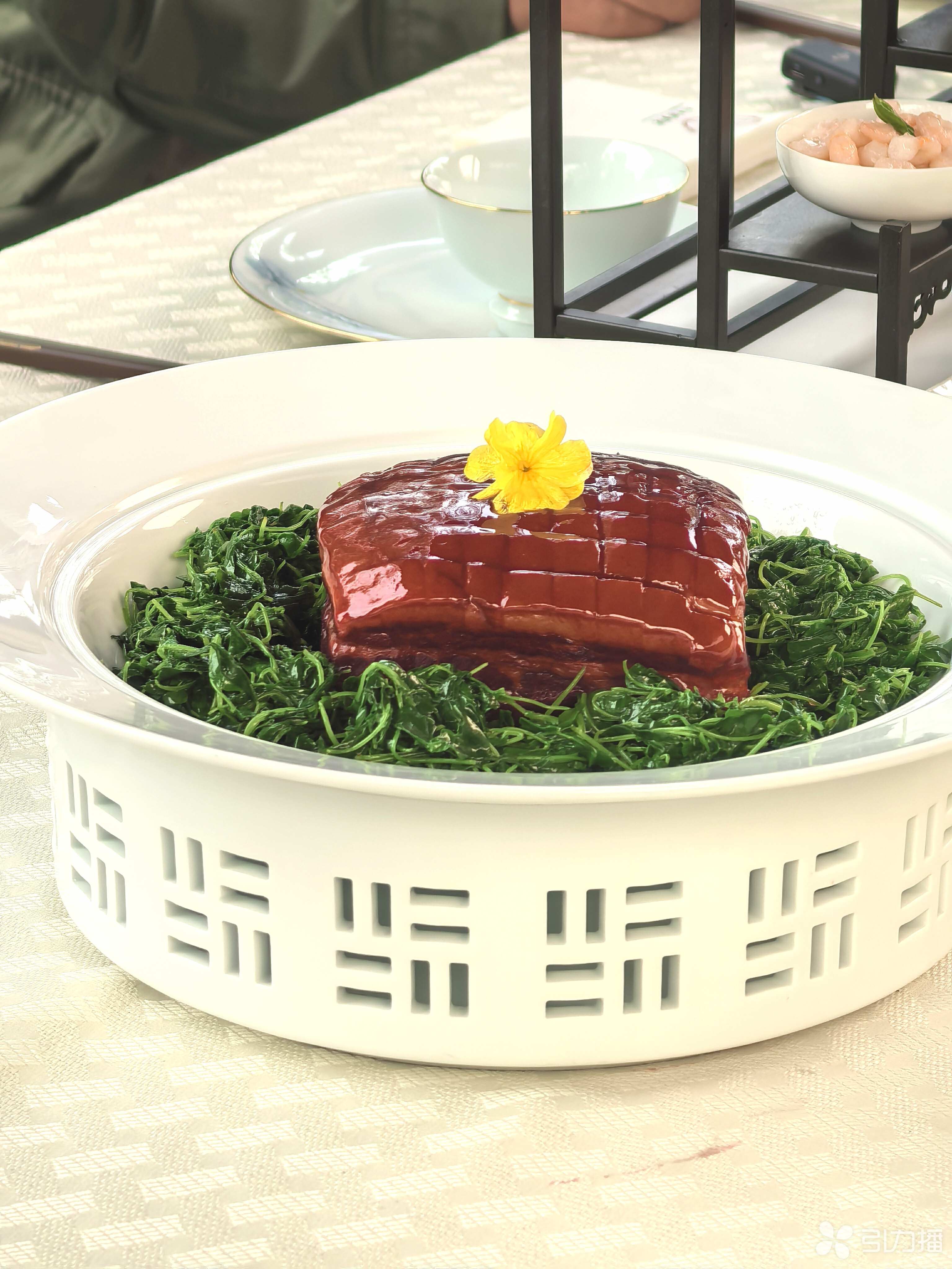 有了头道鲜,更有开春肉,三叶酱汁肉是苏州人春日餐桌的灵魂。这道被称作“开春第一块肉”的美味,色泽红亮如胭脂,铺于碧绿金花菜之上,甜咸适口、入口酥烂。“酱汁肉最考验厨师对火候与成型的精准把控。”李俊生这样说。