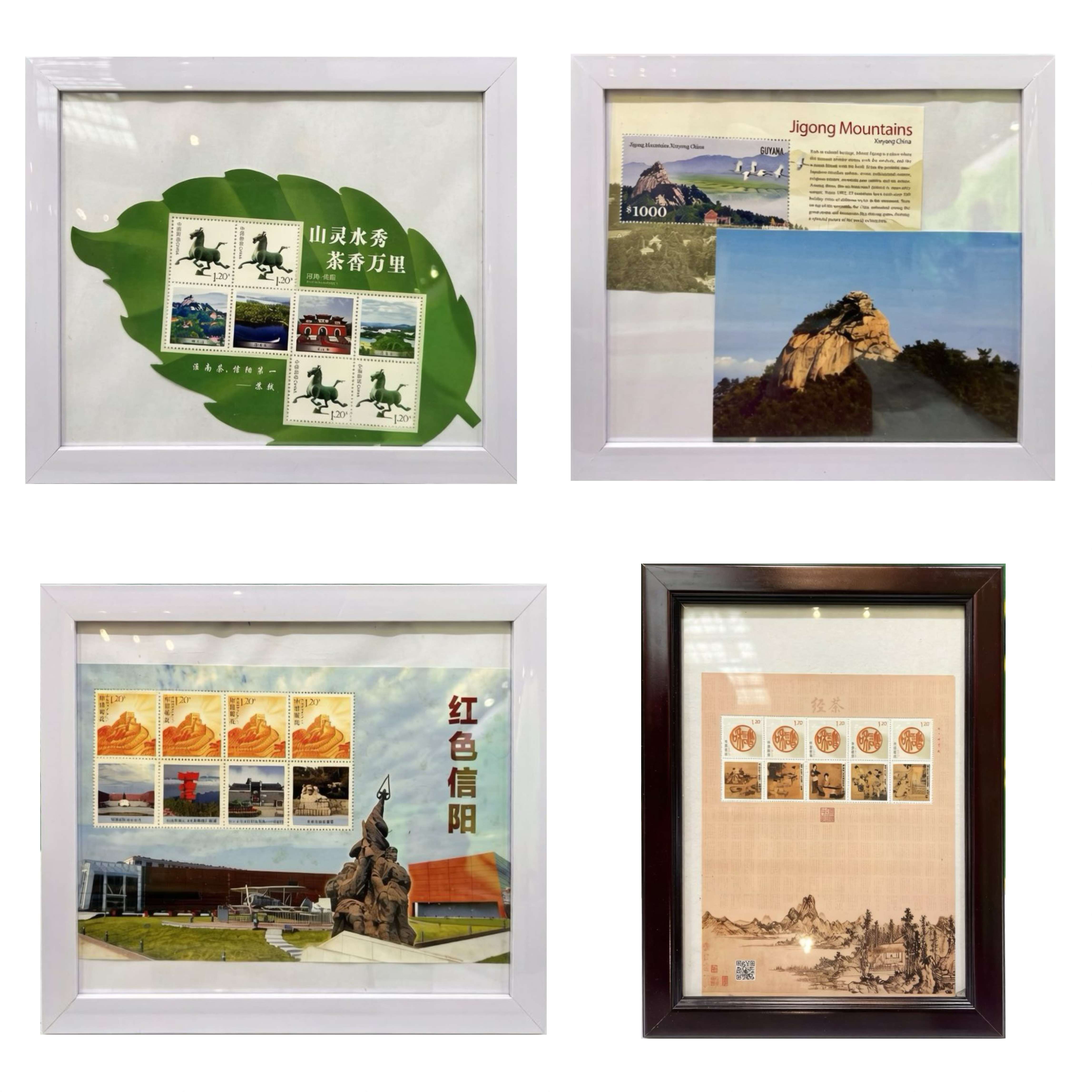 本次特别发行的《信阳毛尖·云顶春芽》纪念封,将书法“茶”字融于云雾茶山与祥云仙鹤间,搭配中国邮政标志性邮资票与传统篆刻纹样,古韵雅致。与之交相辉映的“茶香万里”“鸡公山”“红色信阳”“茶经”四枚个性化邮票相框,分别将大别山水的灵秀、信阳毛尖的馥郁、革命老区的赤诚、品茗修心的雅韵凝于方寸。一封一框,既是可珍藏的文化名片,更是向四海宾朋发出的茶乡邀约。